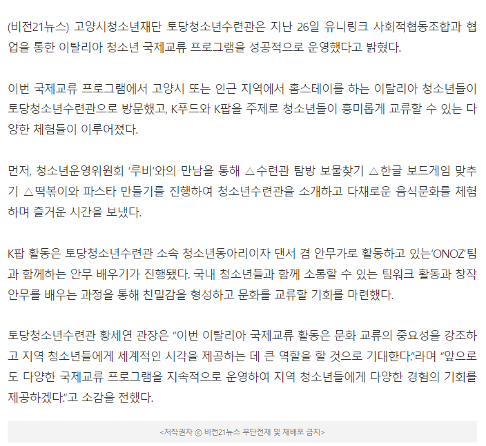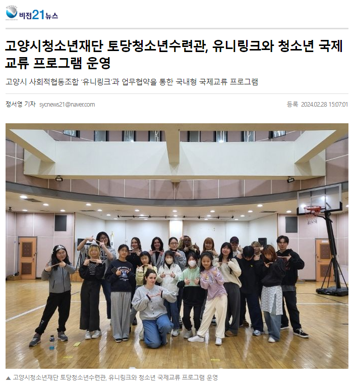 고양시청소년재단 토당청소년수련관, 유니링크와 청소년 국제교류 프로그램 운영